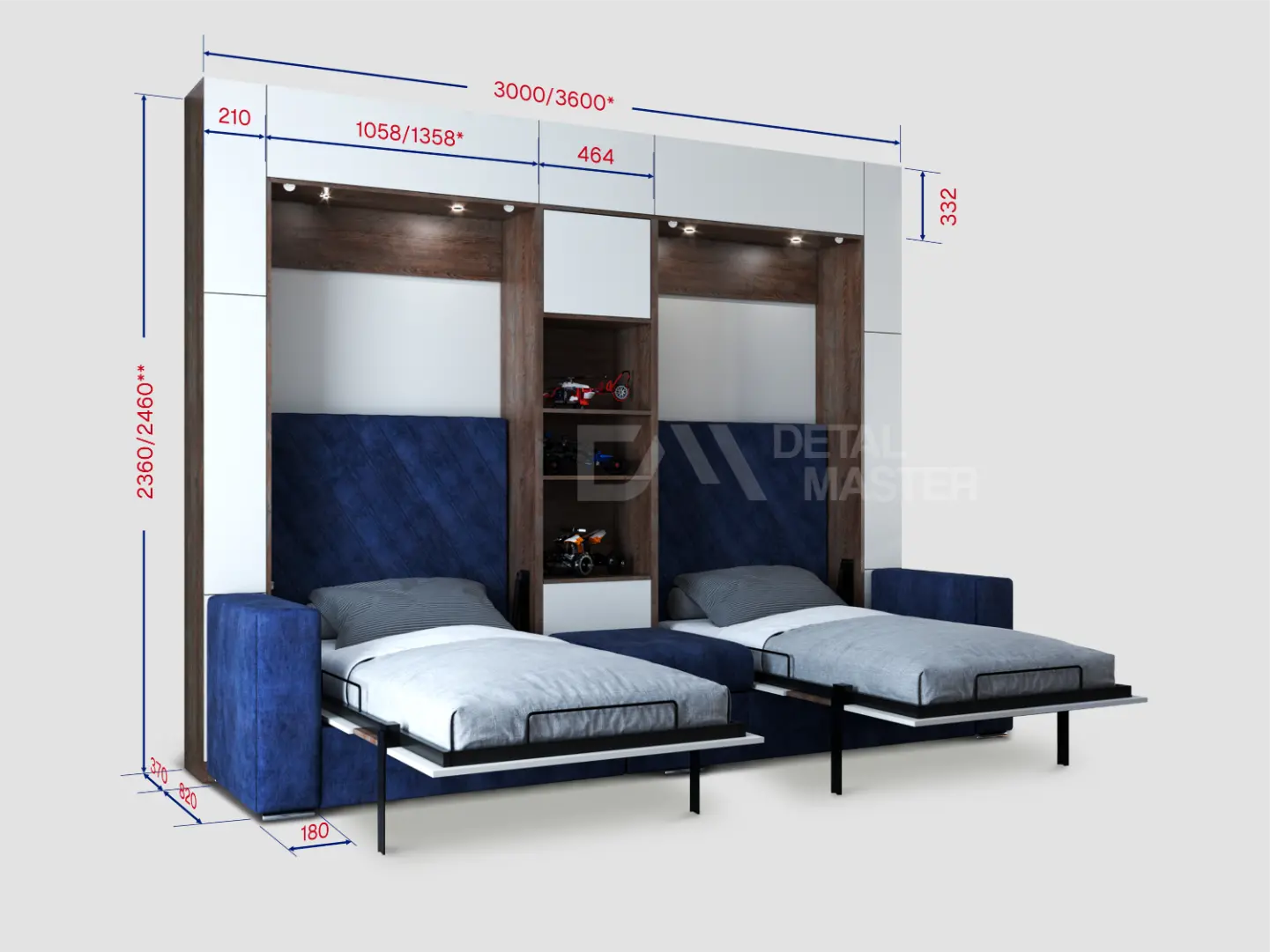 Дополнительные опции, такие как: освещение, зарядное устройство, розетки, мягкое изголовье, матрас, мягкий борт - не входят в стоимость шкаф-кровати "Twin". Вы всегда можете самостоятельно их добавить в опциях или написать менеджеру при оформлении заказа.